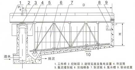 主要由耙架、槽架、中心支架、集电装置、传动装置等组成,它的传动装置是把电动机的运动和动力传递给挂着靶子的桁架,使桁架在池子内围绕中心均匀地旋转,并把浓缩产品靶向池底中心的排料口,而澄清的溢流水则从池子四周溢出,再由环形溢流槽排出。